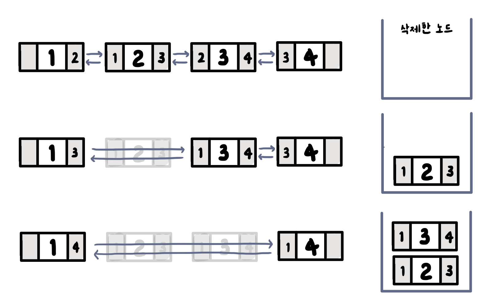 선택한 노드를 trashBin에 넣어주고 양 옆의 노드들 링크 정보를 변경해준다.