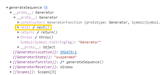 window console창에 console.dir(generator)를 찍어보면 아래와 같이 제너레이터 객체를 반환하는 것을 알 수 있다.